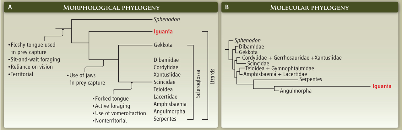 Несмотря ни на что, старое морфологическое дерево не разрушилось, не изменилось, а, напротив, стало еще крепче. Игуаны, как и в прежних, классических схемах, поместились в стволе филогенетического дерева чешуйчатых. Свои примитивные признаки они, как показывает это дерево, унаследовали от общего с гаттериями предка. Змеи и веретеницы отправились в высокие ветви филогенетического древа, где они делят с другими ящерицами специализированные признаки: раздвоенный язык, используемый для активной пищедобывательной стратегии, когти, участвующие в поимке добычи, отсутствие территориальности, сильно развитые обонятельный и вомероназальный органы, специализированное сочленение челюстей с черепом и так далее.