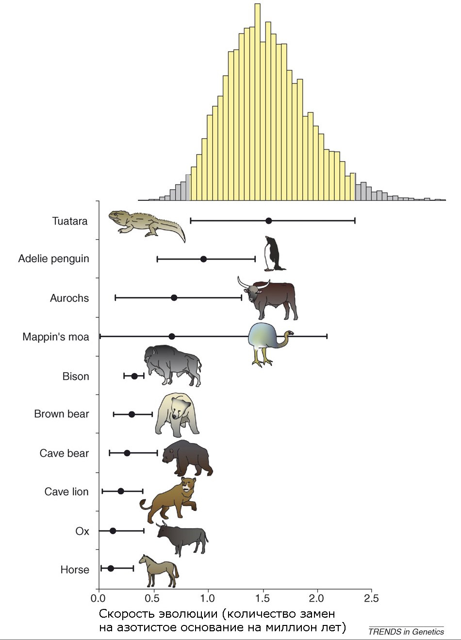 Рис. 4. Скорость молекулярной эволюции у гаттерии — древнейшего вида рептилий возрастом около 220 млн лет, единственного ныне живущего представителя отряда Клювоголовых. Изображение из обсуждаемой статьи в Trends in Genetics