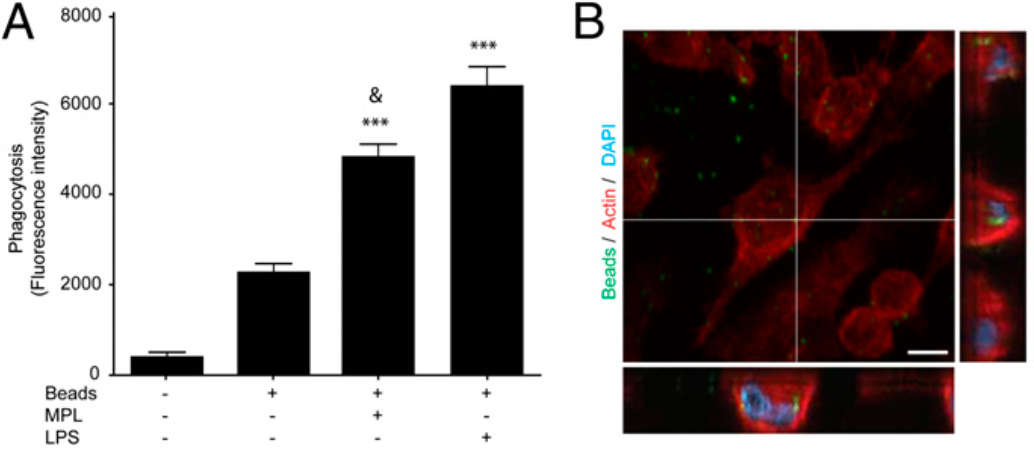 Рис. 3. MPL стимулирует фагоцитоз в клетках микроглии мыши. А — и MPL, и немодифицированный липополисахарид (LPS) стимулируют фагоцитоз флуоресцирующих бусин (Beads) Escherichia coli. B — внутриклеточная локализация этих гранул (зеленый) подтверждена данными конфокальной микроскопии. Длина масштабной линейки — 10 мкм. Рисунок из обсуждаемой статьи в PNAS