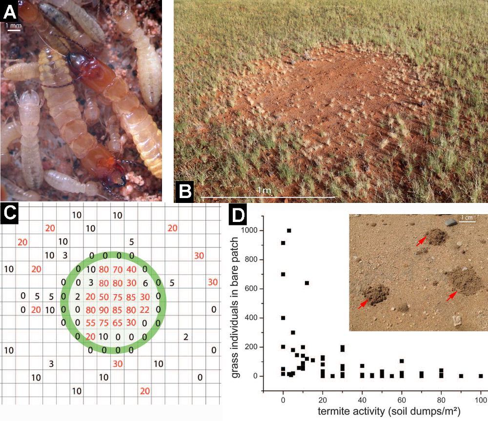Рис. 4. A. Термиты Psammotermes allocerus: крупные солдаты и мелкие рабочие. В. Начальная стадия развития (2–3 года) ведьминого круга, плешь еще не полностью свободна от погибающих злаков. С. Карта активности термитов, измеренной по количеству кучек земли, выброшенных за ночь на поверхность при очистке подземных галерей, в пределах и за пределами ведьминого круга (зеленым цветом показано периферическое кольцо из долгоживущих злаков). Шаг сетки — 1 м. За пределами круга учет проводился только в случайно выбранных квадратах; остальные квадраты показаны пустыми. D. График, показывающий обратную зависимость между активностью термитов (количество кучек почвы, выброшенной на поверхность, показано по горизонтальной оси) и количеством злаков, растущих внутри ведьминого круга (по вертикальной оси). Стрелки на фото указывают свежие выброшенной термитами почвы (темная от влаги). Иллюстрации из обсуждаемой статьи Juergens, 2013. The Biological Underpinnings of Namib Desert Fairy Circles (C, D) и дополнительных материалов к ней (A, B)