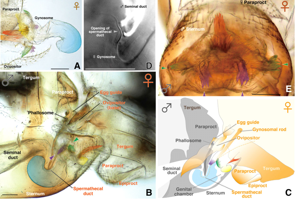 Рис. 2. Гениталии и спаривание Neotrogla curvata. A — гиносома в состоянии эрекции; B, C — копуляция, вид сбоку; E — вид снизу; D — увеличенное изображение, показывающее, что отверстие канала сперматеки самки (opening of spermathecal duct) во время спаривания оказывается точно напротив семявыводящего канала самца (seminal duct). Разными цветами подкрашены части гиносомы: голубым — концевая часть, оранжевым — базальный стержень, желтым — дорзальный выступ, зеленым, красным и сиреневым — три участка с шипами. Соответствующие три кармана в вагине самца отмечены треугольными стрелками тех же цветов. Длина масштабной линейки 0,1 мм. Изображение из обсуждаемой статьи в Current Biology