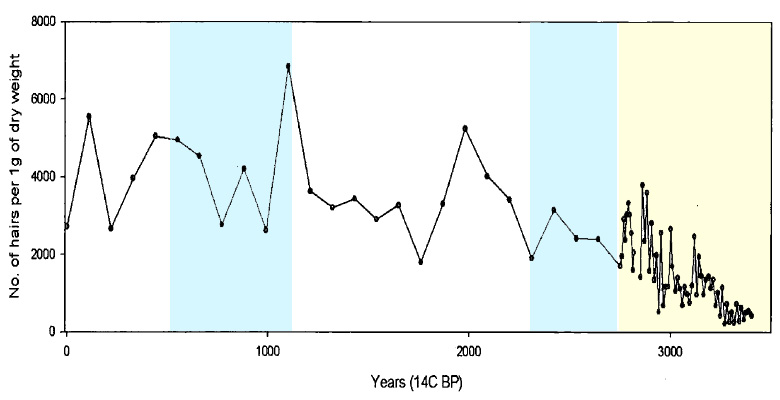 Обилие волосков морского котика в последовательных слоях почвы (по данным за последние 3439 лет) на острове Южная Георгия и сопутствующие изменения климата; желтым цветом показана теплая эпоха, голубым — похолодание. График из исследования V. A. Foster, 2005. Late Holocene records of Antarctic fur Seal (Arctocephalus gazella) population variation on South Georgia, sub Antarctic