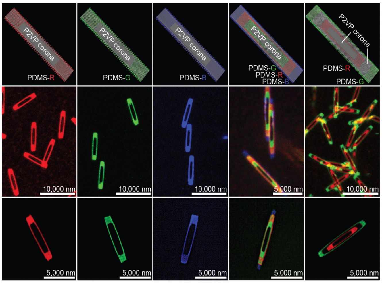Чтобы наглядно продемонстрировать контроль над площадью и химическим составом поверхности, авторы вырастили мицеллы, последовательно добавляя к первичной прямоугольной мицелле из ПФС–П2ВП полимеры с разными цветными (флуоресцентными) группами (рис. 5). Подробнее о цветных мицеллах и о том, зачем они нужны, можно прочитать здесь.