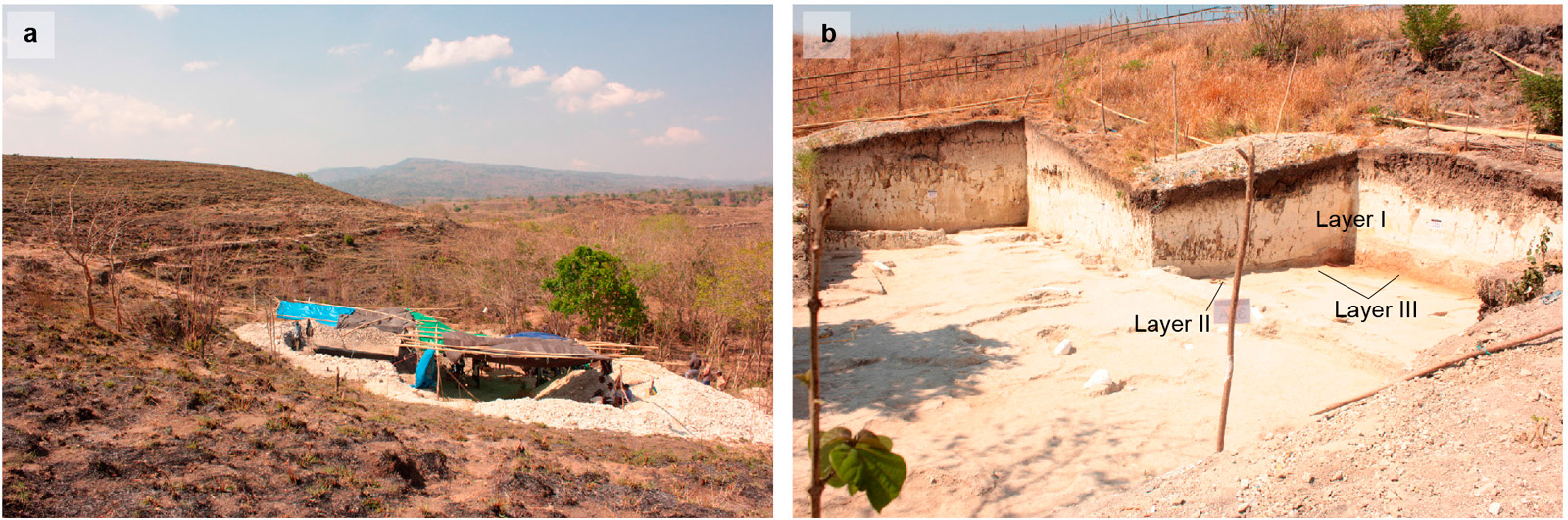 Так выглядит местонахождение Мата Менге, в 74 км от пещеры Лианг-Буа, где были найдены остатки H. floresiensis. а — начало закладки новой траншеи в 2014 году, b — она же в 2015 году. Отчетливо видны разные слои осадочных пород. Layer III — это рыжие палеопочвы, на которые наслоились песчаные речные наносы (Layer II), перекрытые сверху тонкоглинистыми прослоями с вулканическим материалом, быстро заполнившими речное русло и закрывшие его берега (Layer I). Новые находки остатков гоминид сделаны в слое II (Layer II). Фотографии из дополнительных материалов к обсуждаемой статье A. Brumm et al. в Nature