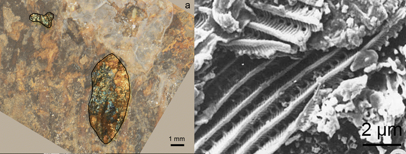 Рис. 3. Слева — кутикула неизвестного насекомого, находящегося в желудке ящерицы G. maarius. Фото из обсуждаемой статьи в Palaeobiodiversity and Palaeoenvironments. Справа — крыловые чешуйки бабочек, обнаруженные в кишечнике летучих мышей из этого же местонахождения; снимок сделан сканирующим электронным микроскопом. Фото из книги A. J. Boucot, 1990. Evolutionary paleobiology of behavior and coevolution