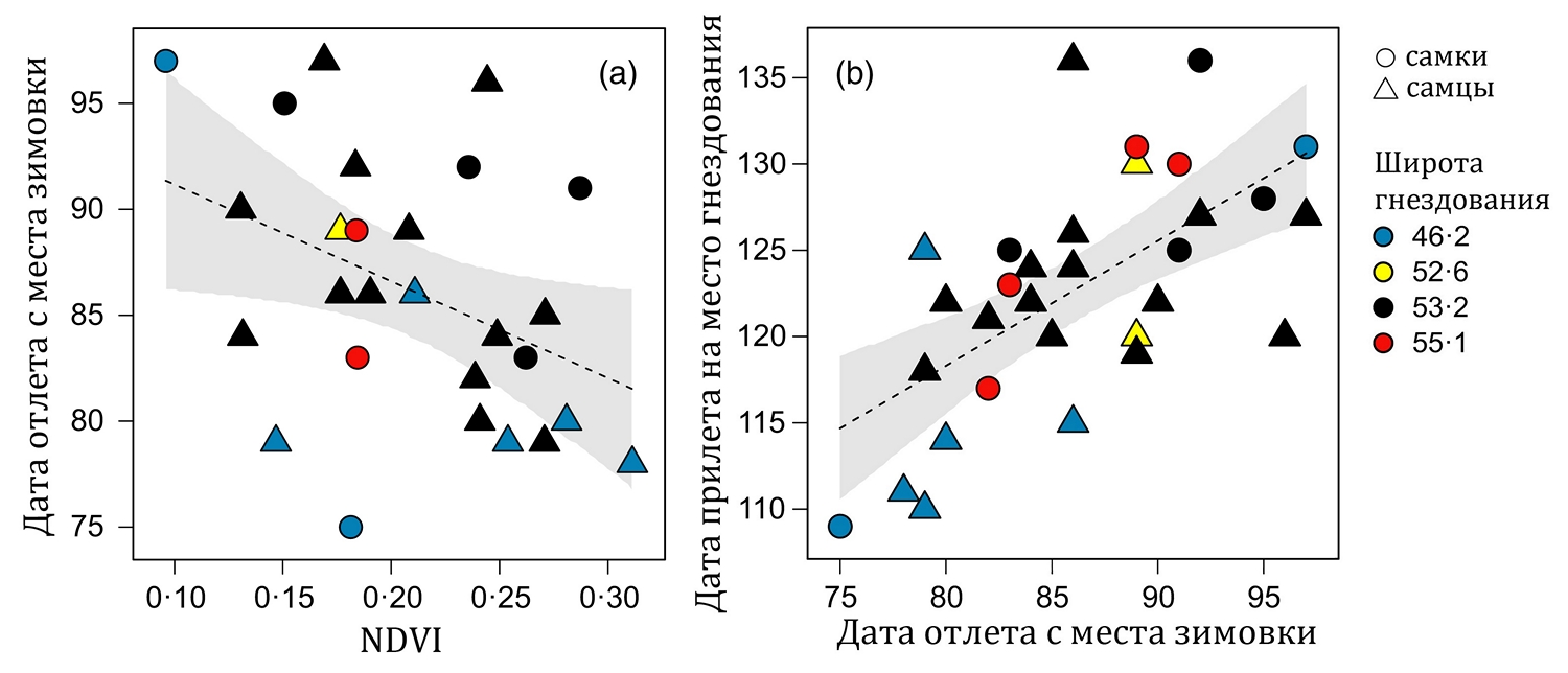 Рис. 7. (а) — связь вегетационного индекса (NDVI) с датой отлета с места зимовки, (b) — связь даты отлета с датой прилета на места гнездования. Дата — порядковый номер дня, считая с 1 января. Рисунок из обсуждаемой статьи в Journal of Animal Ecology