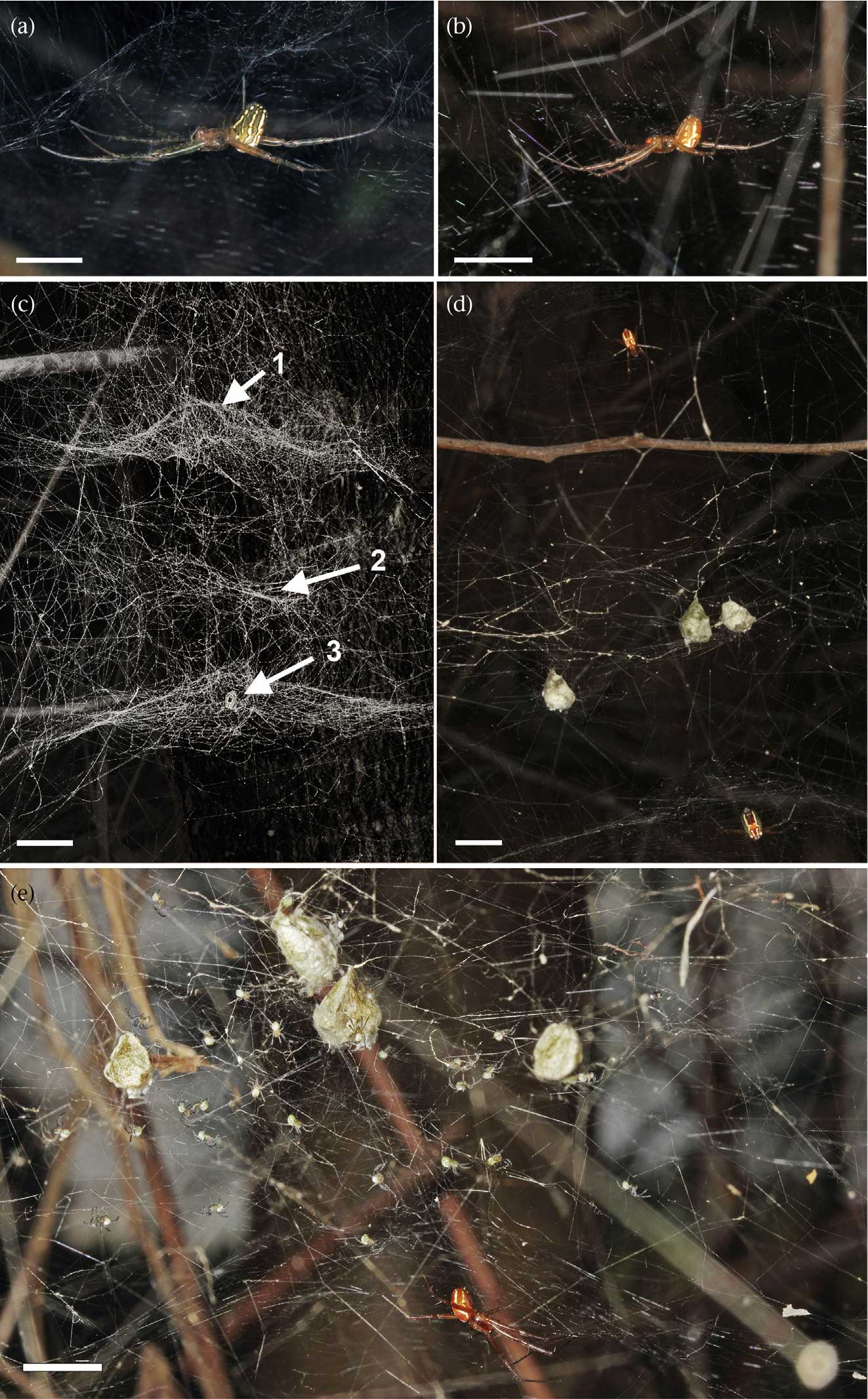 Рис. 2. a — самка M. porracea; b — самец M. porracea; c — ловчие сети самца (стрелка 1), самки (стрелка 3) и положение яйцевых коконов (стрелка 2); d, e — яйцевые коконы при более крупном увеличении. Длина масштабных отрезков: а, b, d, e — 5 мм; с — 10 мм. Фото из обсуждаемой статьи в Animal Behaviour