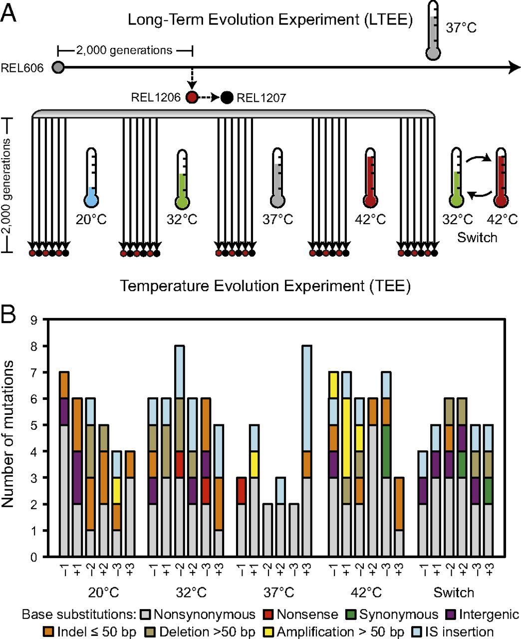 Рис. 2. Геномные изменения в кишечных палочках Escherichia coli, эволюционировавших при разных температурных режимах. А — общая схема эксперимента. Линия E. coli REL1206 была изолирована из долговременного эволюционного эксперимента после 2000 поколений эволюции при 37°C. В описываемом эксперименте шесть популяций эволюционировали в течение 2000 поколений при пяти разных температурных режимах. Три популяции в каждом из пяти вариантов опыта начинались с клона REL1206, неспособного перерабатывать арабинозу (обозначенные как −1, −2, −3) и три — с клона REL1207, способного к этому (+1, +2, +3). Эти клоны отличались одной заменой нуклеотида, которая не влияла на их приспособленность. В — распределение всех полученных в ходе эксперимента 159 мутаций по популяциям и типам генетических изменений. Рисунок из обсуждаемой статьи в PNAS