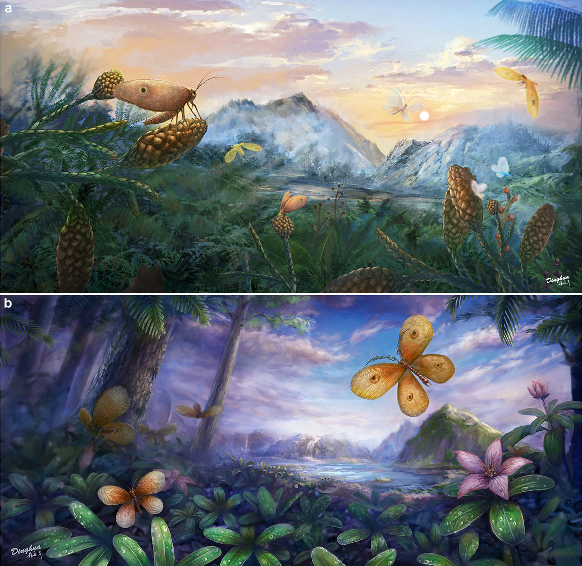 Рис. 3. Палеонтологическая реконструкция, на которой художник изобразил юрских каллиграмматид, найденных близ китайской деревни Даохугоу (a) и меловых каллиграмматид из бирманского янтаря (b). Изображение: Phys.org
