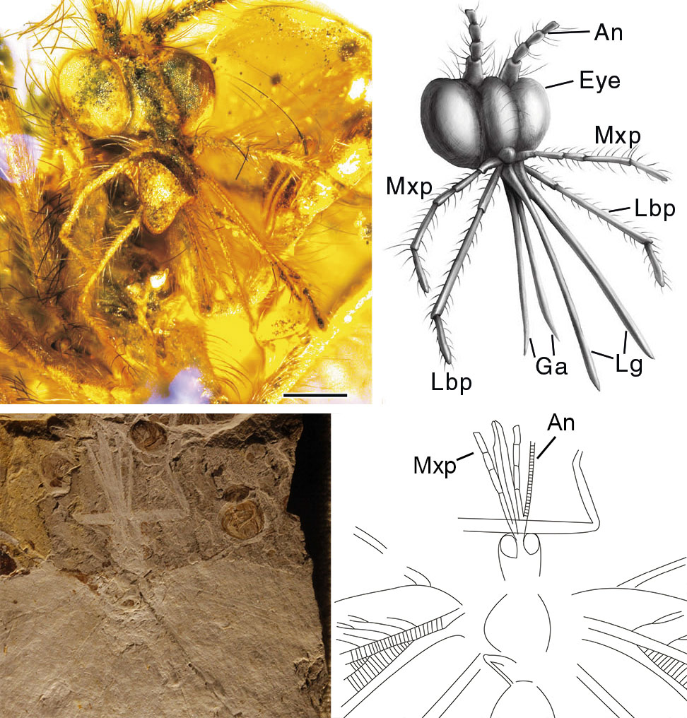 Рис. 4. Вверху — ротовые части бирманской каллиграмматиды Oligopsychopsis groehni. Изображение из обсуждаемой статьи в Nature Communications. Внизу — ротовые части классической каллиграмматиды из средней юры Китая: An — антенна, Ga — галеа, Lbp — нижнегубной щупик, Lg — лигула, Man — мандибула, Mo — ротовые части, Mxp — максиллярный щупик. Изображение из статьи: Q. Yang et al., 2014. Mesozoic lacewings from China provide phylogenetic insight into evolution of the Kalligrammatidae (Neuroptera)