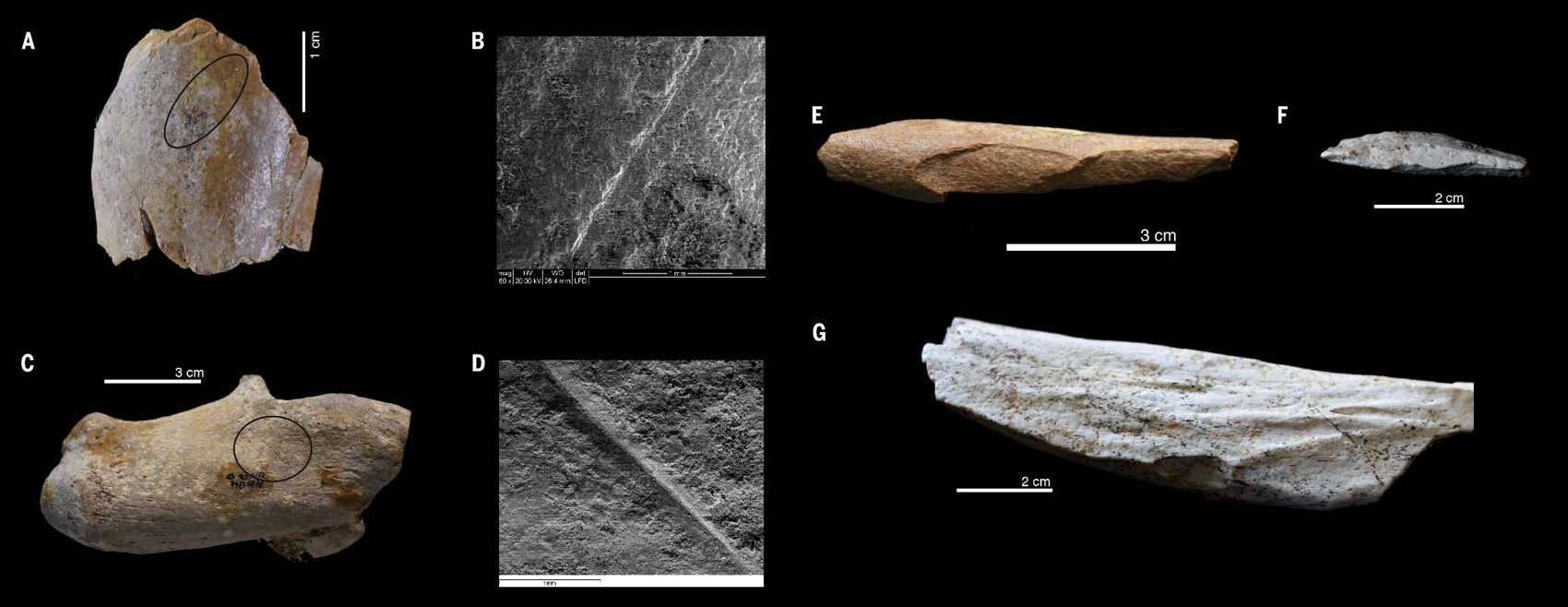 Рис. 3. Кости со следами от каменных орудий. A, B — царапина на фрагменте плечевой кости представителя семейства полорогих среднего размера из слоя AB-Lw. C, D — царапина на лошадиной пяточной кости из AB-Lw. E–G — обломки костей, расколотых гоминидами при помощи каменных орудий (E — из слоя AB-Lw, F, G — из слоя AB-Up). Изображение из обсуждаемой статьи в Science