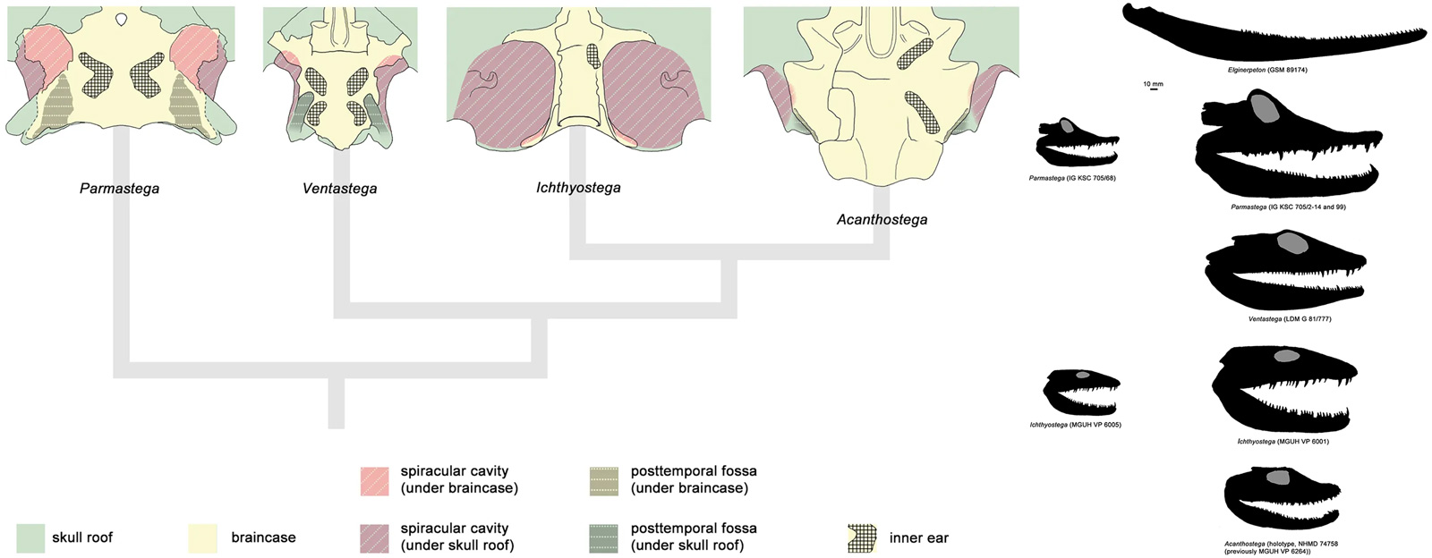 Рис. 5. Слева: сравнительная схема строения окципитальных (затылочных) областей пармастеги, ихтиостеги, вентастеги и акантостеги (вид снизу). Бази-экзоципитальный комплекс сохранился только у ихтиостеги и акантостеги, у этих родов внутреннее ухо (inner ear, показано штриховкой) показано только с одной стороны. Внутреннее ухо представлено канавками под передние и задние косые полукруглые каналы, за исключением ихтиостеги, у которой оно представлено саккулюсом. Skull roof — черепная крыша, braincase — основание черепа, spiracular cavity — дыхательная полость, posttemporal fossa — посттемпоральная ямка. Справа: сравнение реконструируемых черепов девонских тетрапод. Изображена и нижняя челюсть Elginerpeton — самого крупного из известных девонских тетрапод, чей череп пока не удалось реконструировать. Правее показаны черепа самых крупных особей, левее — самых мелких из известных. Рисунки из обсуждаемой статьи в Nature