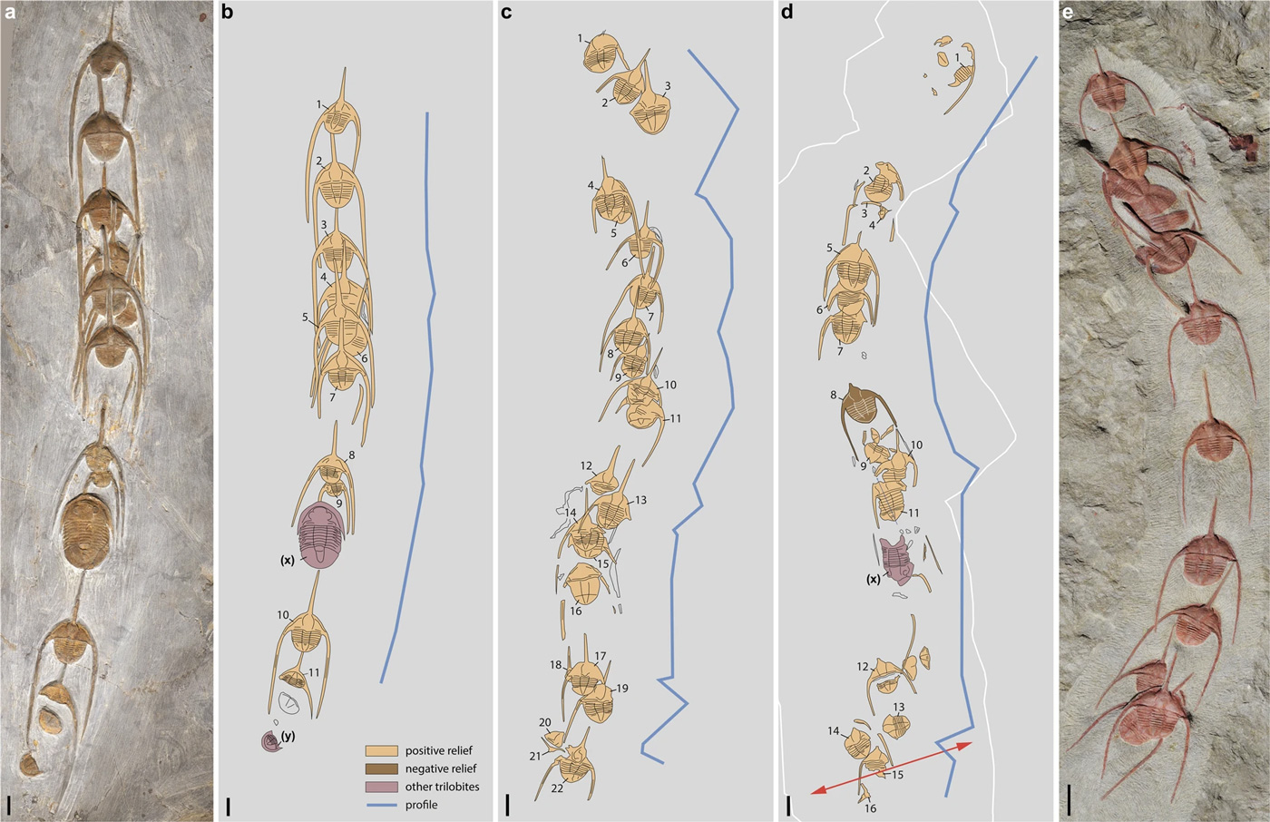 Все особи в цепочках ориентированы в одном направлении, сохраняют определенную дистанцию и поддерживают контакт друг с другом с помощью задних шипов. Очевидно, смерть трилобитов наступила мгновенно, и в момент гибели они передвигались в цепочке. Если бы они были «выложены» в линию водными потоками уже после смерти, характер расположения особей был бы совершенно другой: они были бы частично перевернуты или развернуты в произвольных направлениях.