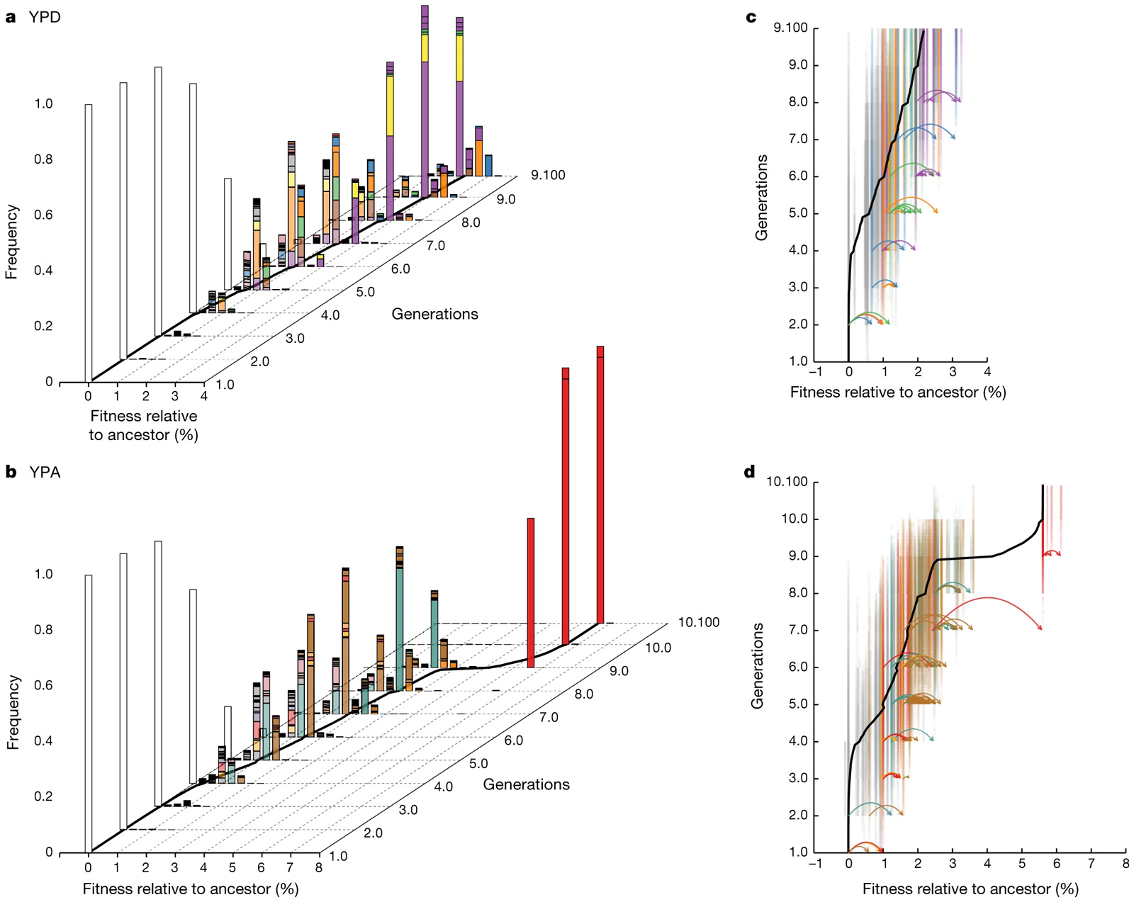 Рис. 3. Динамика приспособленности в ходе эксперимента. Вверху (a, c) — популяция YPD, внизу (b, d) — популяция YPA. На левых графиках (a, b) по вертикальной оси отложена численность линий (Frequency), по горизонтальным осям — приспособленность (на сколько процентов она выше, чем у предкового генотипа; Fitness relative to ancestor (%)) и время в поколениях (Generations). Белые столбики — предковый генотип (до появления в нем мутаций, заметно повышающих приспособленность), цветные столбики соответствуют линиям, обозначенным теми же цветами на рис. 2. Черной сплошной линией показана средняя приспособленность популяции. Видно, что на фоне неуклонного роста средней приспособленности в популяции сохраняется большой разброс по этому показателю, так что получается ползущая слева направо «волна». На правых графиках (c, d) разноцветные вертикальные черточки соответствуют эволюционирующим линиям (цвета те же, что и на других рисунках; прозрачность обратно пропорциональна численности линии). По горизонтальной оси отложена приспособленность, по вертикальной — время. Дугообразные стрелочки показывают, как в результате полезных мутаций то и дело появляются новые, более приспособленные сублинии. При этом представители отстающих линий нередко «перепрыгивают» через исходно более приспособленных конкурентов. Изображение из обсуждаемой статьи в Nature