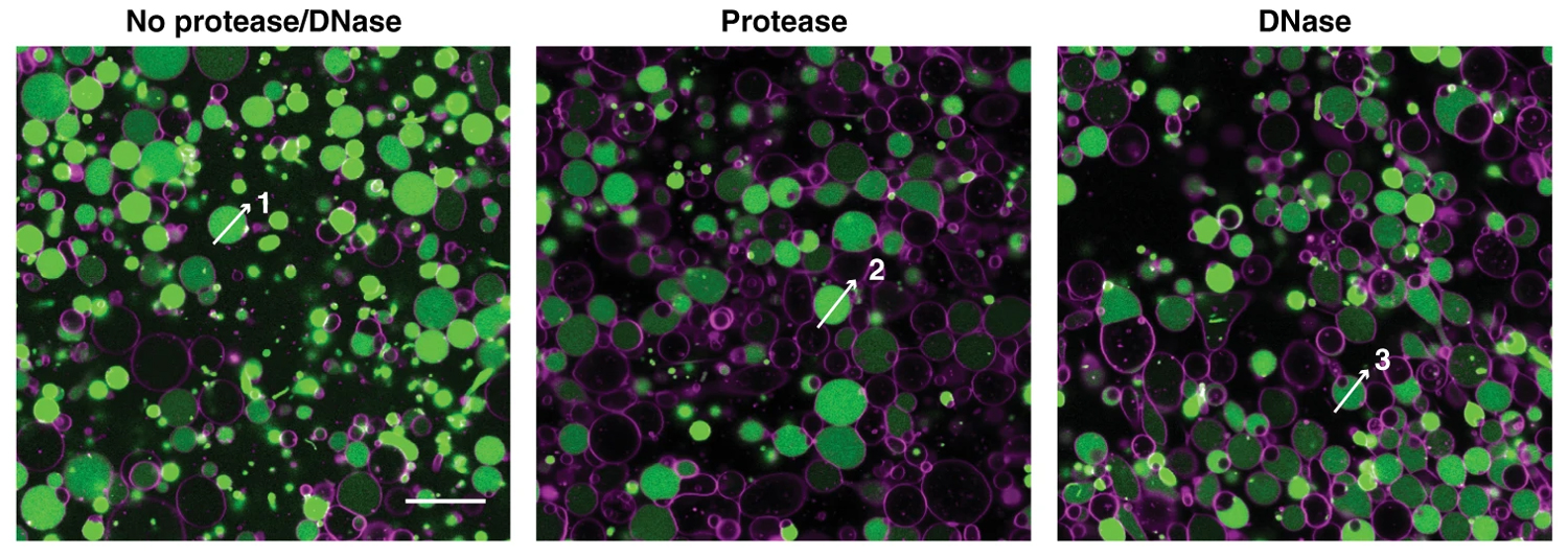 Рис. 4. Изображение липосом, полученное с помощью флуоресцентной микроскопии. Мембраны липосом помечены красным флуоресцентным белком (они выглядят как фиолетовые колечки). К реакции была добавлена ДНК желтого флуоресцентного белка. Без добавления протеазы и ДНКазы экспрессия генов происходит как внутри, так и вне липосом (слева). При наличии протеазы (в центре) или ДНКазы (справа) экспрессия генов локализуется внутри липосом. Рисунок из обсуждаемой статьи в Nature Communications