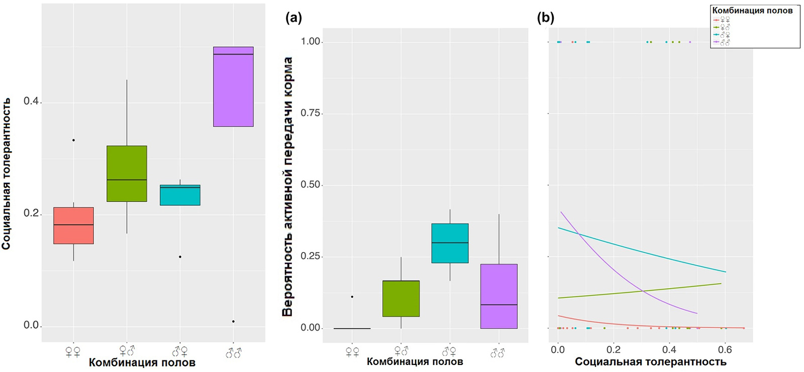 Рис. 6. Слева — социальная толерантность между представителями разных полов в подопытной группе голубых сорок (Cyanopica cyana). Толерантность оценивалась как частота совместного кормления в предварительном эксперименте (пояснения в тексте). Справа — влияние пола и социальной толерантности между особями голубых сорок. a — частота передачи корма в зависимости от пола «дарителя» и «получателя». b — влияние комбинации полов (показаны различными цветами) в сочетании с социальной толерантностью (горизонтальная ось). Черная горизонтальная линия соответствует медиане частот, границы цветных «ящиков» — верхней и нижней квартилям, «усы» — минимальному и максимальному из отмеченных значений (в пределах полутора интерквартильных интервалов; прочие значения показаны точками). ♂ — самцы, ♀ — самки. Графики из обсуждаемой статьи в Scientific Reports
