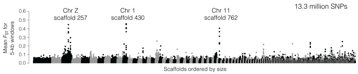 Результаты полногеномного секвенирования и сравнение двух видов по 13,3 млн однонуклеотидных замен. Здесь видны три участка геномов на хромосомах 1, 11 и Z (половая хромосома), где у двух видов различия заметно выше, чем в целом по геному. Рисунок из обсуждаемой статьи в Science