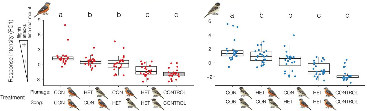 Самки вьюрковых овсянок, по-видимому, выбирают женихов, ориентируясь на оперение и брачные песенки. Это показали поведенческие эксперименты на гнездовых территориях. Ученые сделали модели, точь-в-точь походящие на самцов двух видов. Эти чучелки они усаживали на веточки рядом с гнездами — они служили зрительным стимулом. Кроме того, использовался еще и звуковой стимул — записи песенок самцов, которые прокручивали в течение 5 минут (столько длится обычное представление самцов этих видов). Задача была в том, чтобы отследить поведенческие реакции самцов на эти два стимула; из результатов можно понять, какой из стимулов воспринимается птичками лучше, на какой из стимулов они ориентируются.