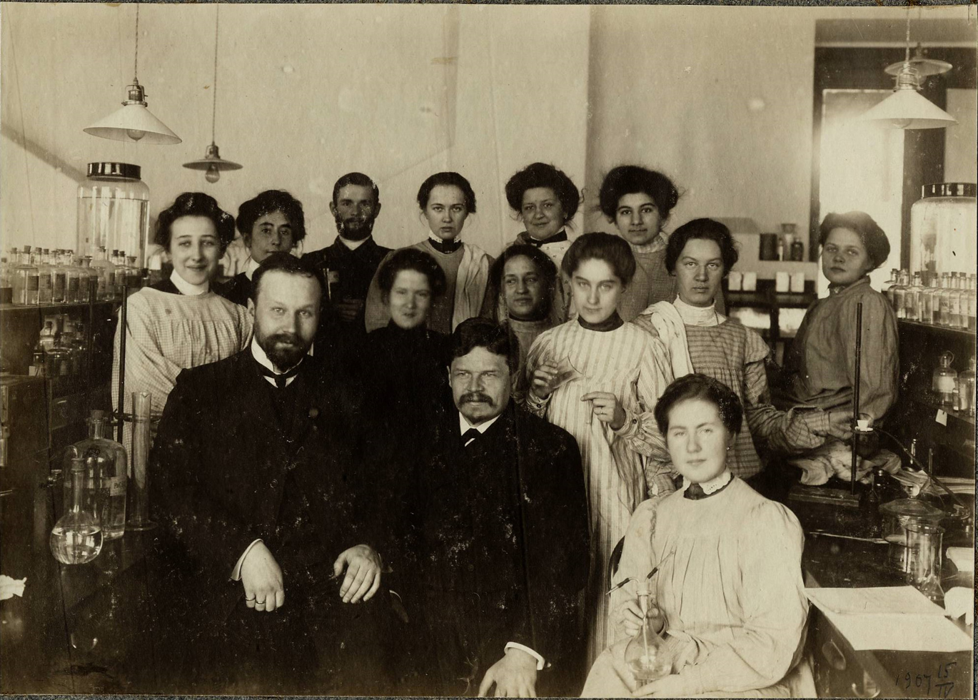 В. А. Догель сидит слева в переднем ряду, Е. В. Лермонтова — крайняя слева во втором ряду. Фото из архива семьи Е. В. Лермонтовой