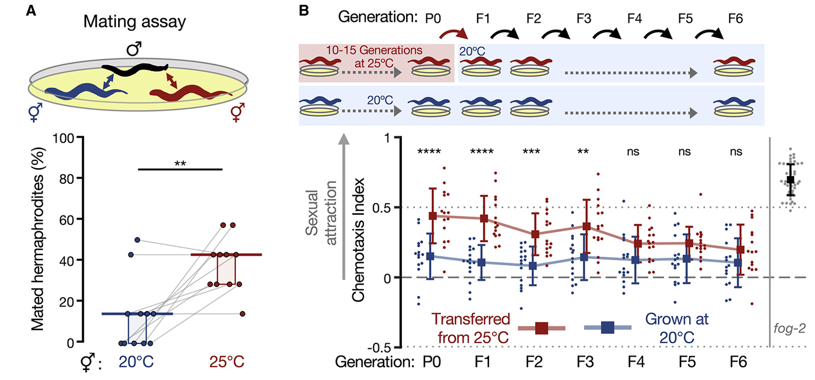 Авторы провели и другой эксперимент по оценке привлекательности гермафродитов — испытание в соревновании за спаривание. Суть в следующем. На чашку Петри помещали 11 самцов и две конкурирующих группы «самок» (в каждой группе было по 7 особей). Чашку оставляли в покое ровно на час, а затем смотрели, сколько «самок» оказались оплодотворены в каждой из конкурирующих групп. Схему и результаты этого эксперимента можно видеть на рис. 3, А. Чтобы понимать, какие гермафродиты подверглись перекрестному оплодотворению, в этом эксперименте ученые использовали генно-модифицированных самцов, сперматозоиды которых светятся благодаря наработке в них зеленого флуоресцирующего белка. Каждая пара точек на графике, соединенных линией — результат одного отдельного конкурентного эксперимента. Видно, что в большинстве случаев гермафродиты линии червей, выращиваемой при повышенной температуре, значительно чаще оплодотворялись самцами, чем черви контрольной линии, выращиваемой при 20°C.