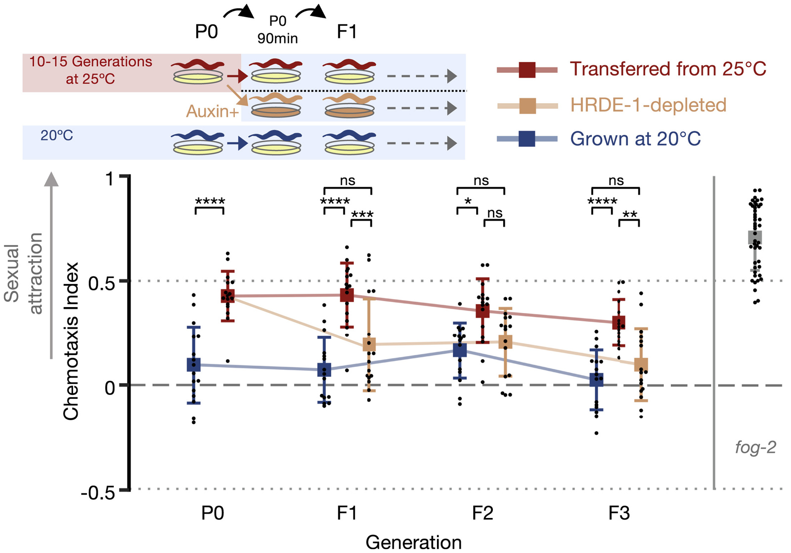 Рис. 4. Схема и результаты экспериментов по оценке роли гена HRDE-1 в эпигенетическом наследовании признака ранней сексуальной привлекательности (оцененной по активации хемотаксиса самцов летучим феромоном) у родительского поколения C. elegans (P0) и у потомков, не подвергавшихся стрессовому воздействию (F1–F3). Красным цветом отмечены значения для линии, подвергшейся протяжении 10–15 поколений воздействию повышенной температуры; оранжевым — для такой же линии, в которой родительские особи кратковременно (в течение часа) подверглись воздействию ауксина, обеспечившему полную деградацию белка HRDE-1; синим — для контрольной линии, выращиваемой постоянно при комфортной температуре 20°C. Звездочки над планками вверху графика указывают на наличие достоверного различия между сравниваемыми данными. Справа для сравнения показан индекс хемотаксиса для линии с мутацией fog-2 (положительный контроль). Рисунок из обсуждаемой статьи в Developmental Cell