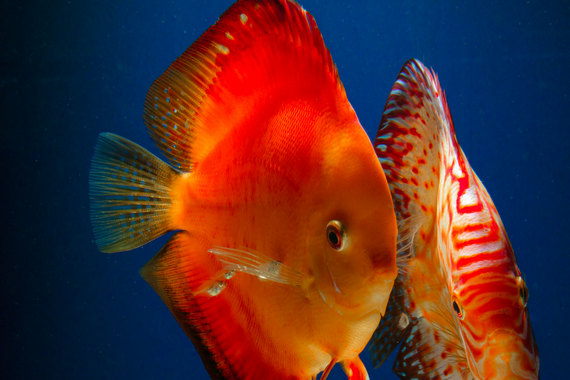 Этот дискус (Symphysodon sp.) выглядит покрытым мелкими паразитами, но на самом деле это — счастливый родитель, выкармливающий потомство своей слизью. К сожалению, пол у этих рыб определить трудно, а мальков кормят оба родителя, так что трудно сказать, папа это или мама
