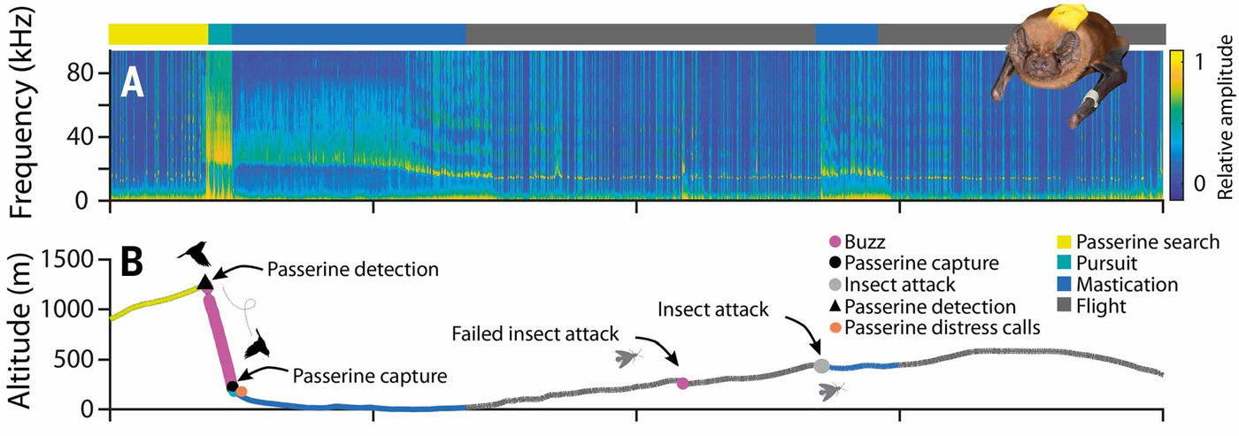 Эхолокационная активность гигантской вечерницы во время удачной охоты на зарянку (A) и высота полета во время преследования, поимки и дальнейшей охоты на насекомых (B): обратите внимание на более интенсивную эхолокационную активность во время погони за птицей и более длительный период жевания (Mastication, синие участки графика высоты) в сравнении с охотой на насекомое. Рисунок из обсуждаемой статьи