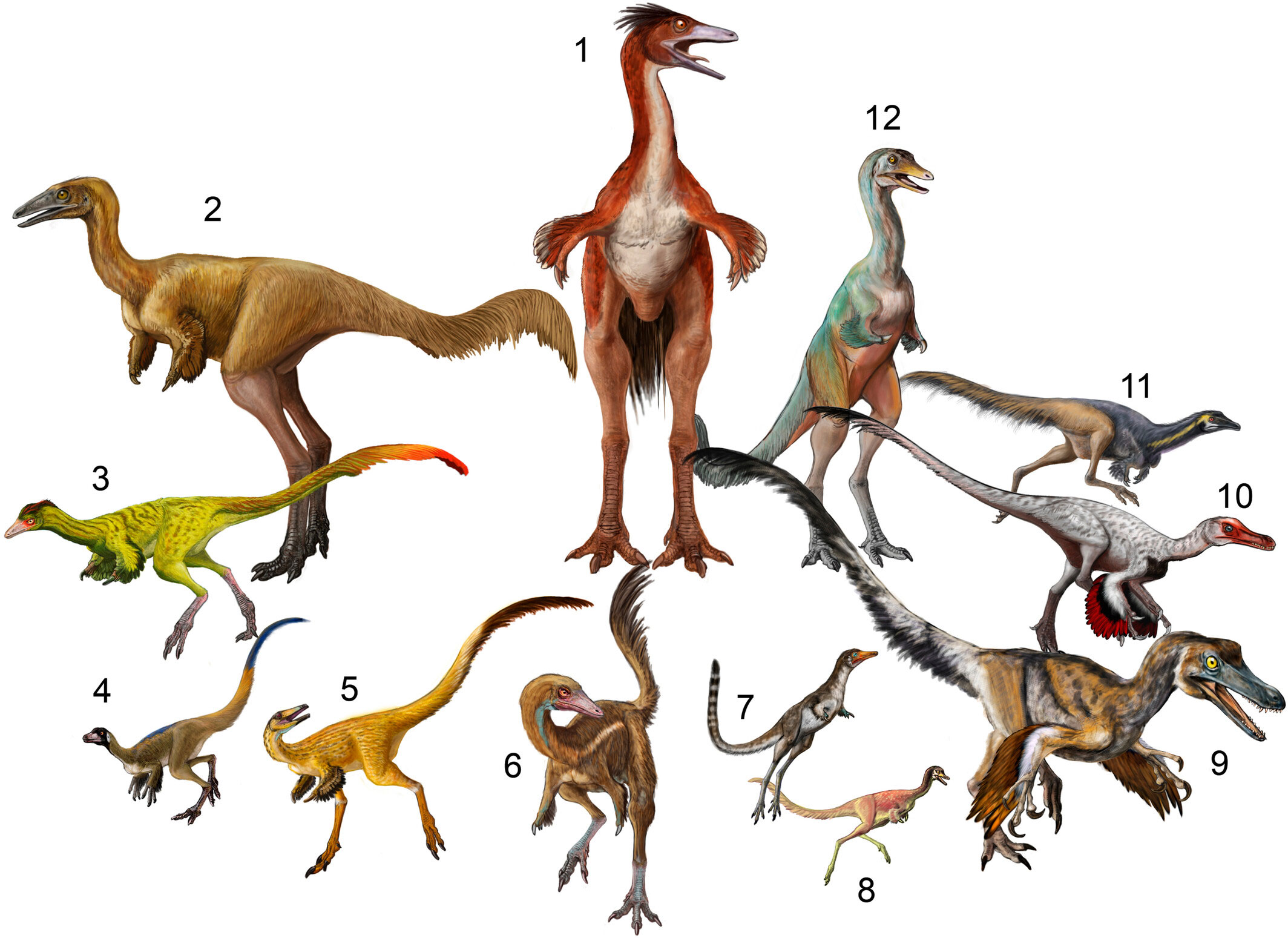 Некоторые известные виды альваресзаврид: 1 — Bonapartenykus; 2 — Patagonykus; 3 — Alvarezsaurus; 4 — Alnashetri; 5 — Albertonykus; 6 — Heptasteornis; 7 — Dzharaonyx; 8 — Linhenykus; 9 — Haplocheirus; 10 — Shishugounykus; 11 — Kol; 12 — Bannykus. Рисунок © Abel G. Montes из статьи Meso et al., 2024. Body size and evolutionary rate analyses reveal complex evolutionary history of Alvarezsauria
