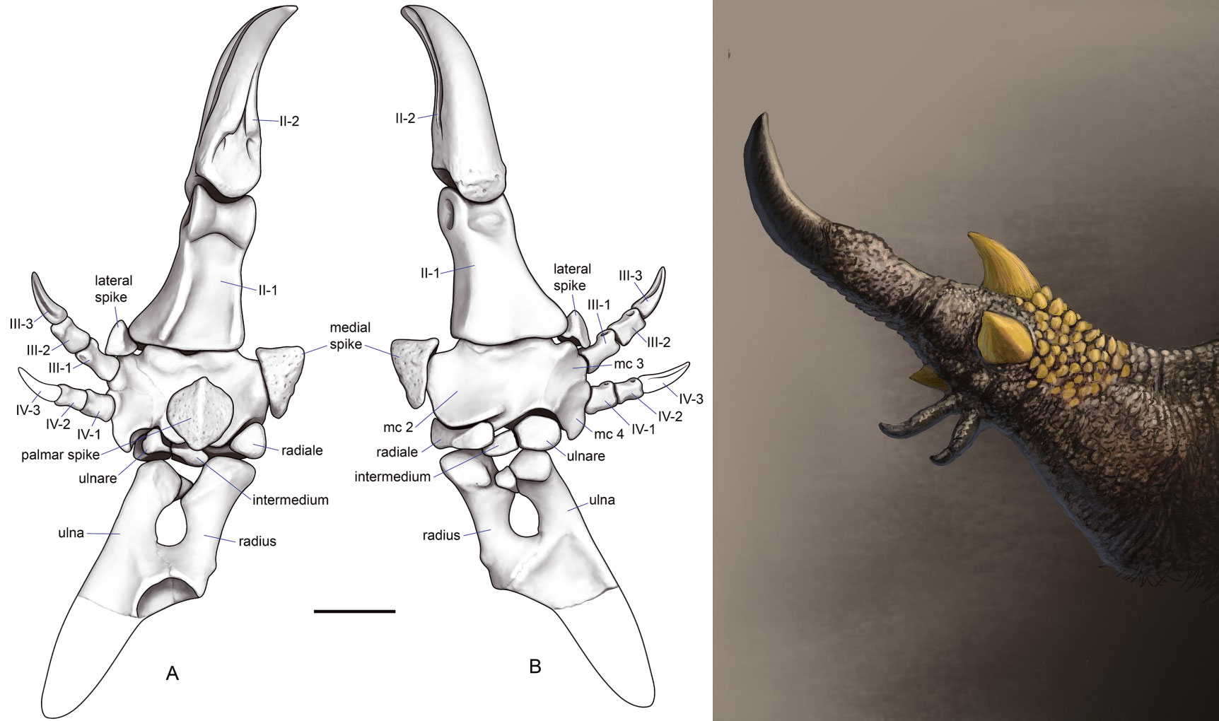 Реконструированная конечность манипулоникса в двух проекциях (слева, рисунок из обсуждаемой статьи) и ее предполагаемый прижизненный вид, с желтыми кожными окостенениями (справа, рисунок © Joschua Knüppe с сайта bsky.app). Обратите внимание, что кератиновые оболочки делали коготь и кожные шипы значительно крупнее, чем сохранившиеся в окаменелостях
