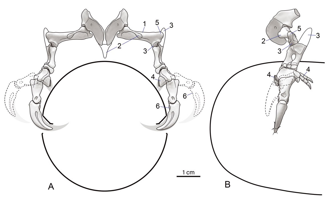 Схема захвата манипулониксом крупного яйца спереди (А) и сбоку (B). Поперечный диаметр яйца — около 6 сантиметров, что типично для яиц овирапторид. Положение второго пальца в максимально вытянутом положении перед прокалыванием скорлупы обозначено пунтирной линией. Кератиновые оболочки когтей и запястных шипов закрашены светло-серым. Цифрами обозначены анатомические особенности, говорящие в пользу такого поведения: 1 — положение плечевой кости, характерное для парвикурсорин и позволяющее широко разводить короткие передние конечности в стороны; 2 — увеличенный дельтопекторальный гребень плечевой кости и предполагаемая килевидная грудина (не сохранилась у манипулоникса, но присутствует у других парвикурсорин) предполагают наличие сильных грудных и плечевых мышц; 3 — единственный дистальный суставной мыщелок плечевой кости и гипертрофированный локтевой отросток локтевой кости, предположительно, обеспечивали резкое разгибание локтевого сустава, освобождающее яйцо из захвата и позволяющее ему разбиться о землю; 4 — редуцированные пальцы и запястные окостенения позволяли крепче удерживать яйцо при транспортировке, не давая ему болтаться (это привело бы к растрескиванию скорлупы, пробитой большими когтями); 5 — выемка на плечевой кости, позволяющая совершать мощные движения при выдергивании когтей из яичной скорлупы для освобождения яица; 6 — отсутствие бугорка, к которому крепилась мышца-сгибатель, у других хищных динозавров позволяющая сгибать палец с когтем, что необходимо в том числе при копании. Рисунок из обсуждаемой статьи