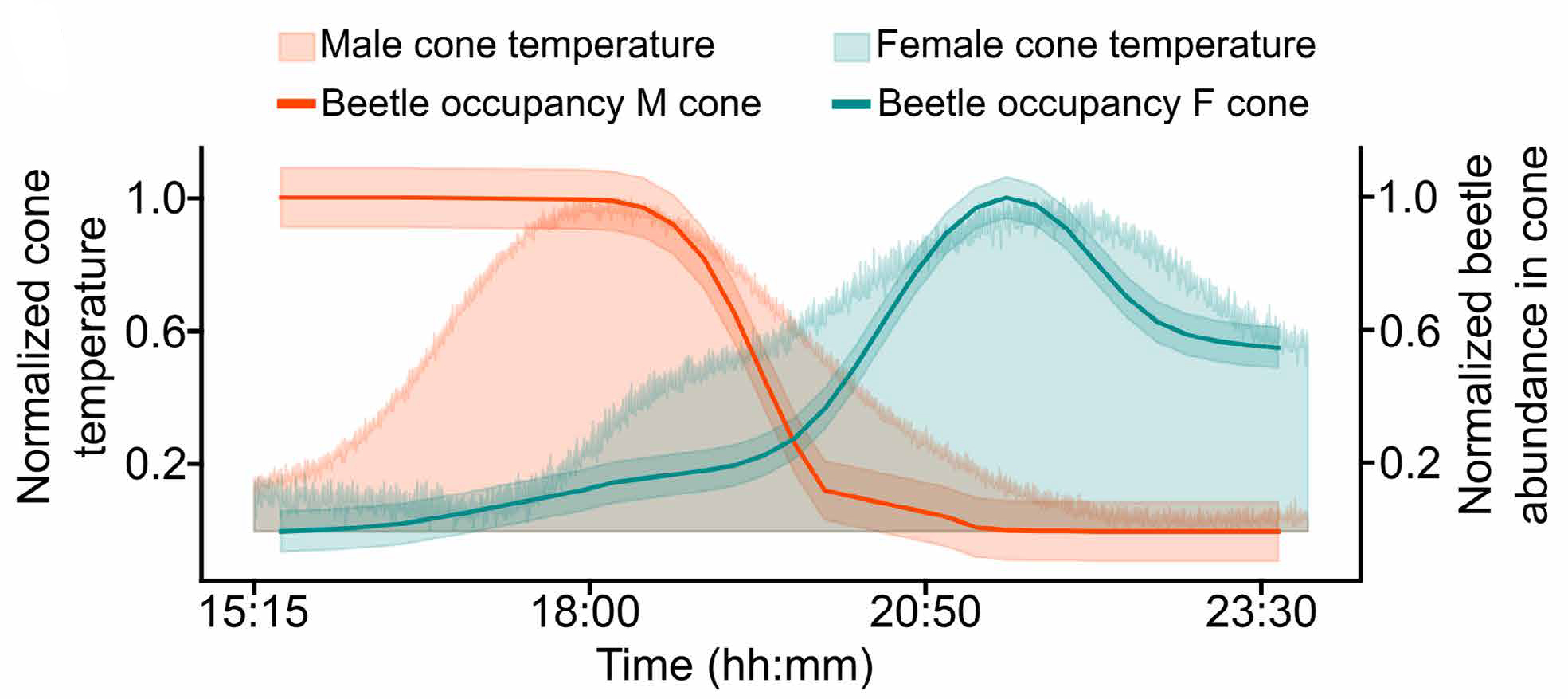 Рис. 4. Связь между нагревом шишек и поведением жуков-опылителей во времени. По горизонтальной оси показано время суток (часы:минуты). Левая вертикальная ось — нормализованная температура шишек, правая — нормализованная численность жуков на шишках. Оранжевая заливка — температура мужских шишек, зеленая — температура женских шишек. Оранжевая линия — присутствие жуков в мужских шишках, зеленая линия — присутствие жуков в женских шишках. Вечером мужские шишки активно нагреваются, и жуки концентрируются на них. По мере снижения температуры мужских шишек и одновременного нагрева женских жуки покидают мужские шишки и переходят в женские, обеспечивая перенос пыльцы. Рисунок из обсуждаемой статьи