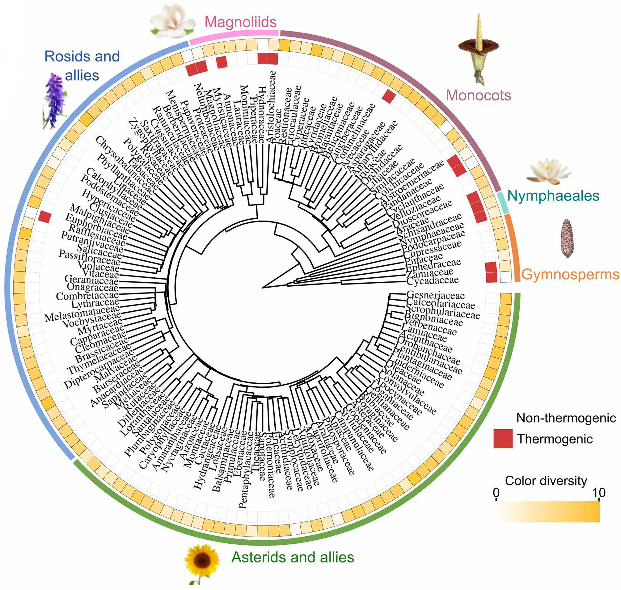 Рис. 8. Распределение термогенеза (красным отмечены термогенные растения, белым — нет) и разнообразия окраски (интенсивность желтого цвета отражает разнообразие окраски), нанесенное на филогенетическое древо семенных растений (Spermatophyta). Рисунок из обсуждаемой статьи