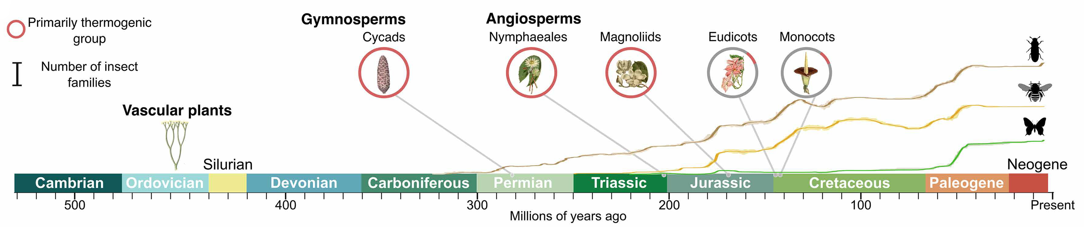 Наконец, авторы сопоставили данные о происхождении термогенеза с ископаемыми находками растений и насекомых. Анализ показал, что термогенез появился у саговников еще в раннем пермском периоде — около 275 миллионов лет назад — и представляет собой одну из самых древних известных стратегий опыления. Жуки, которые были ночными, обладали простым цветовым зрением и стали одними из первых опылителей семенных растений, возникли и начали диверсифицироваться раньше, чем пчелы и бабочки. Последние появились значительно позже и эволюционировали параллельно с бурным расцветом современных цветковых растений (рис. 9).