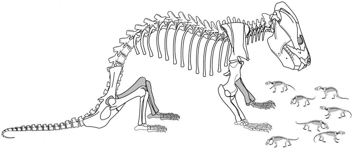 Относительный размер скелетов взрослого кайентатерия и его детенышей: хотя черепа малышей были в десять раз меньше, чем у взрослой особи, они имели те же пропорции. Рисунок © Eva Hoffman с сайта livescience.com