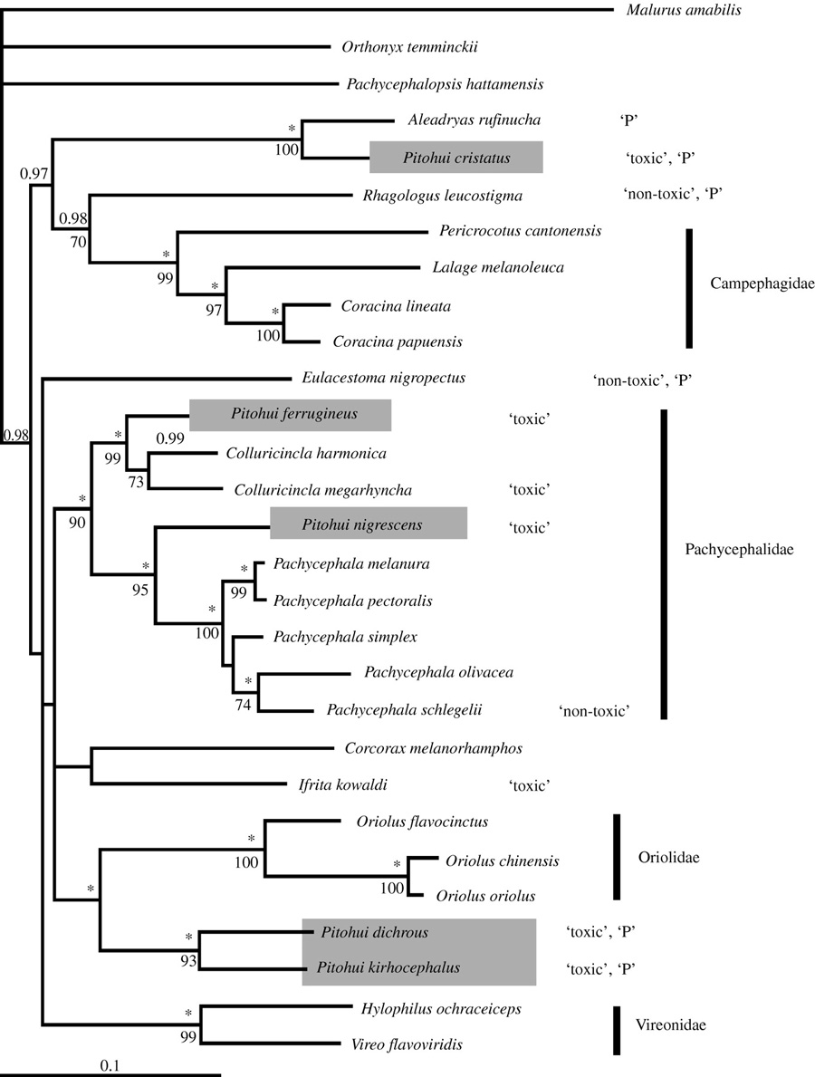 Рис. 5. Филогенетическое дерево, на котором показаны ядовитые (содержащие хоть какое-то количество батрахотоксина) виды, ранее относимые к роду Pitohui. Из статьи K. Jønsson et al., 2008. Polyphyletic origin of toxic Pitohui birds suggests widespread occurrence of toxicity in corvoid birds
