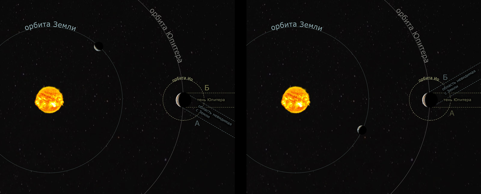 Сначала ответим на вопросы. На схемах на рисунке 2 показаны два варианта взаимного расположения Земли и Юпитера. Затмение Ио для наблюдателя с Земли начинается либо когда спутник либо входит в область за Юпитером относительно Земли (левая схема, точка А), либо когда спутник загораживается тенью Юпитера (правая схема, точка А). Конец затмения в обоих вариантах обозначен буквой Б.