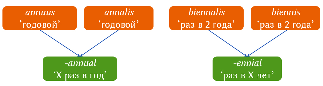 Английские прилагательные на -ennial — тоже результат скрещивания: видно, что в латинских словах типа biennalis по сравнению с английским biennial недостаёт i. Это видно и из русских слов биеннале ‘выставка, проводимая раз в 2 года’ и триеннале ‘выставка, проводимая раз в 3 года’, которые не звучат как *биенниале и *триенниале. По всей вероятности, «лишнее» i в английских прилагательных возникает потому, что у прилагательных типа biennalis в поздней латыни появились аналоги с -i- типа biennis — получается, это уже четвёртый по счёту тип прилагательных от annus ‘год’.