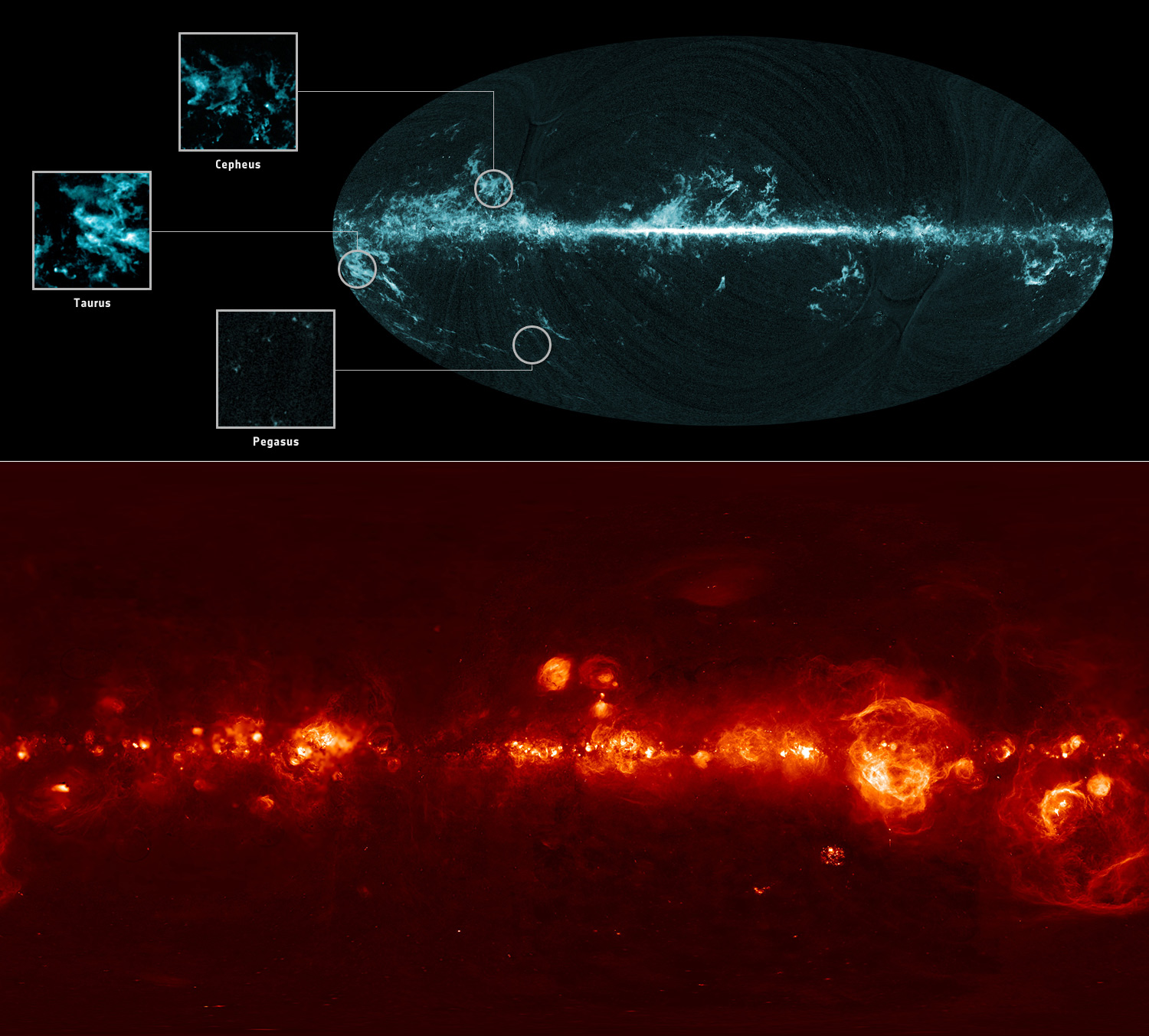 Рис. 1. Сверху: изображение неба в миллиметровом диапазоне, полученное телескопом «Планк». Видно излучение молекул монооксида углерода (CO) из-за перехода из одного вращательного состояния в другое. На врезках показаны некоторые молекулярные облака. Изображение с сайта sci.esa.int. Снизу: небо на длине волны 656 нм. Эти оптические фотоны соответствуют излучению из-за перехода электрона в атоме водорода с третьей орбитали на вторую (линия H-альфа). Хорошо видны области, содержащие нейтральный водород: они самые яркие. Изображение с сайта faun.rc.fas.harvard.edu
