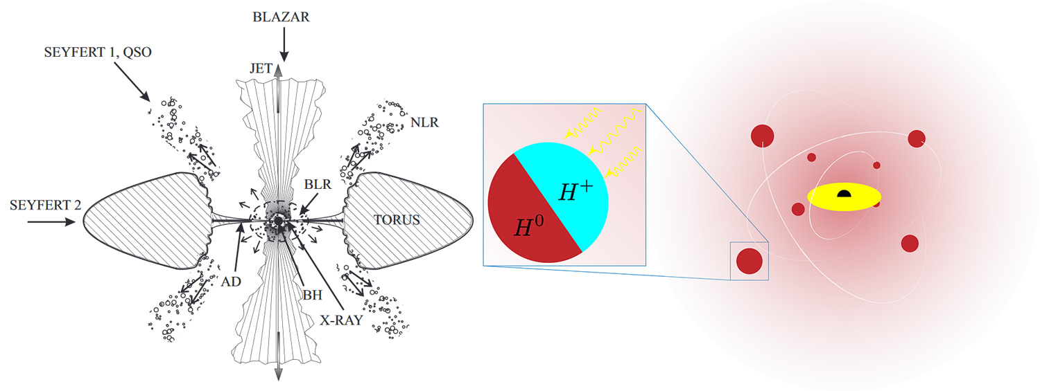 Рис. 5. Область расширенных линий (BLR) в активных галактических ядрах с плотными облаками водорода. В достаточно больших облаках газ, находящийся ближе к черной дыре, ионизирован практически полностью (правый рисунок), но при этом дальняя часть облака уже содержит нейтральный водород, и излучение оттуда в основном возникает из-за более тяжелых ионов (например, ионов магния). Рисунок из статьи P. Jovanović, L. Č. Popović, 2009. X-ray Emission From Accretion Disks of AGN: Signatures of Supermassive Black Holes
