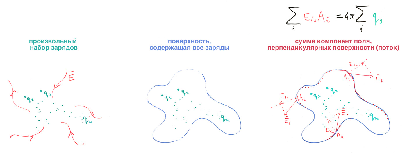 Окружим эти заряды некоторой поверхностью, опять же, произвольной формы, так, чтобы все заряды лежали внутри этой поверхности (рис. 7, в середине). Разделим поверхность на маленькие (в идеале — бесконечно малые) кусочки, каждый из которых имеет площадь: \(A_1\), \(A_2\), ... Возьмем произвольный из этих маленьких кусочков, \(A_i\), и посчитаем компоненту электрического поля, \({E}_i\), перпендикулярную поверхности в этом месте — \(E_{i\perp}\) (рис. 7, справа).