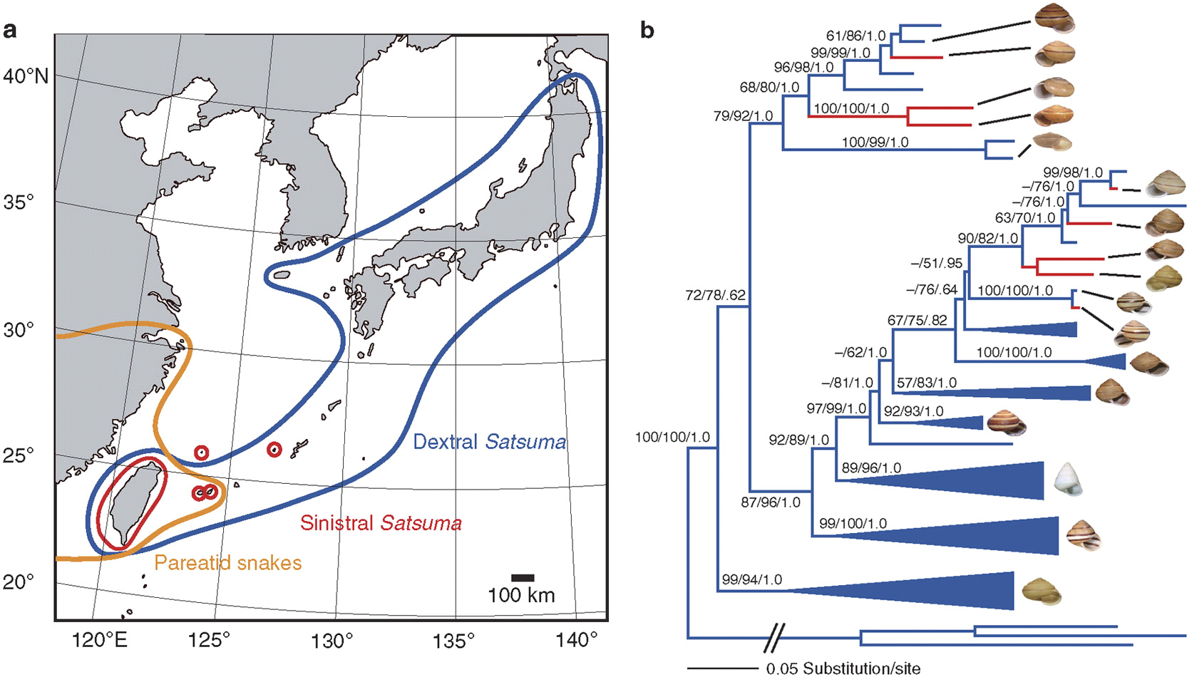 Рис. 2. a — ареалы «праворуких» змей семейства Pareatidae (желтая линия), левозакрученных (красная линия) и правозакрученных (синяя линия) улиток рода Satsuma. «Зазеркальные» улитки живут в основном в «зазеркальном» Китае — на острове Тайвань. b — родственные отношения видов Satsuma показывают, что левозакрученность неоднократно возникала в ходе эволюции. Изображение из статьи M. Hoso et al. A speciation gene for left–right reversal in snails results in anti-predator adaptation