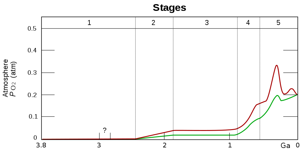Концентрации кислорода в атмосфере Земли за последние 3,8 млрд лет по разным оценкам. Красной и зеленой линиями отмечены границы диапазона имеющихся реконструкций. Предполагается, что в каменноугольном периоде (около 0,3 млрд лет назад) имел место пик, но мнения специалистов о том, был ли он существенно выше нынешнего уровня, расходятся. Изображение с сайта en.wikipedia.org
