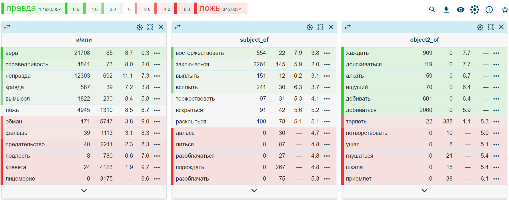Скетчи двух слов можно сравнить при помощи инструмента Word Sketch Difference. Сравним, например, скетчи слов правда и ложь. Зеленым выделены контексты, в которых чаще встречается первое слово, красным — те, в которых чаще встречается второе, а белым — общие для двух слов. Из столбца «subject_of» мы можем узнать, что всплывает чаще правда, а торжествует и то и то, из столбца «object2_of» (прямой объект, второй актант) — что правды жаждут или алчут, а лжи потворствуют, гнушаются ее...