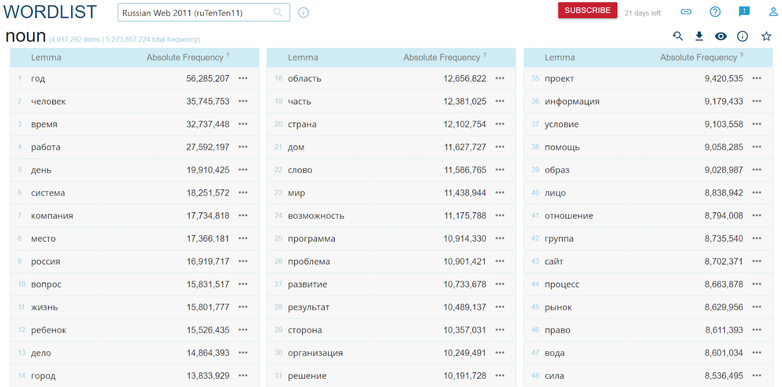 А как «набросать скетч» целого корпуса, чтобы в общих чертах понять, тексты каких жанров и на какие темы в нем содержатся? Например, при помощи инструмента Wordlist посмотреть на самые частотные слова корпуса. Вверху частотного списка любого корпуса будут служебные слова и местоимения, интереснее посмотреть, например, на самые частотные существительные: