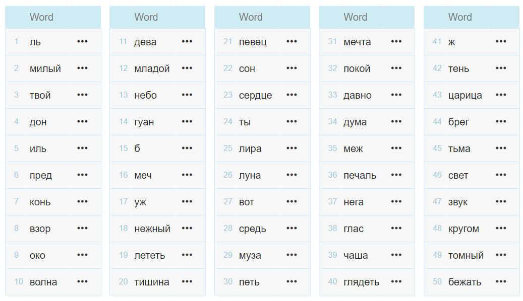 Затем поменяем корпуса местами и при тех же параметрах посмотрим, какие слова более характерны для корпуса поэзии: