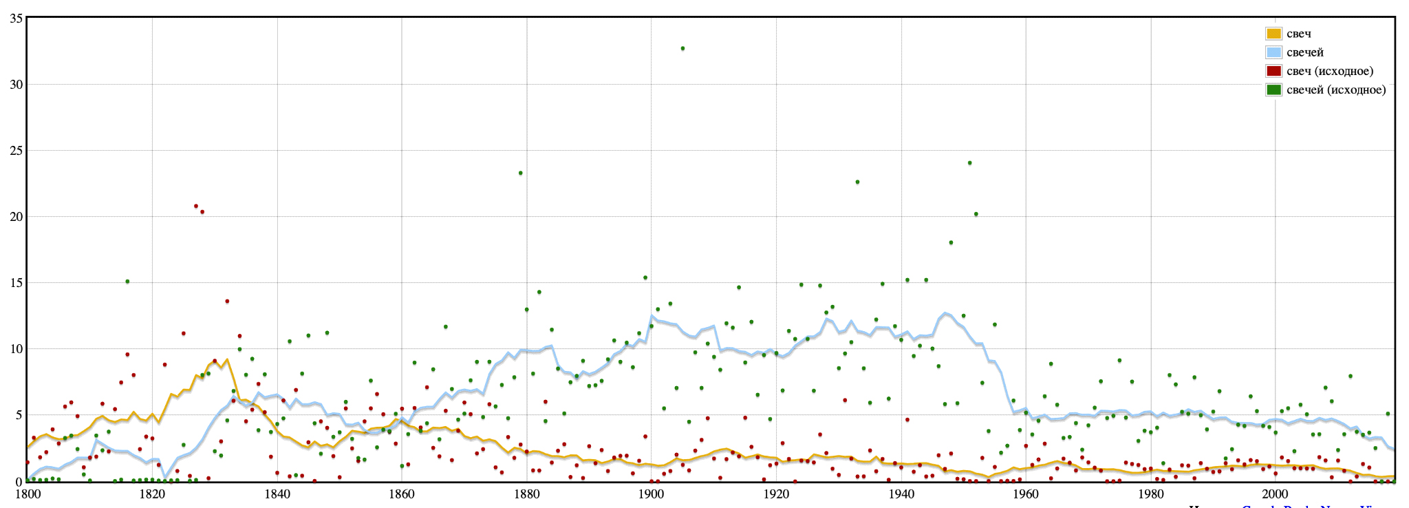 На графике, который позволяет построить Национальный корпус русского языка, видно, как формы свеч и свечей конкурируют в начале XIX века и как его концу форма свечей побеждает: