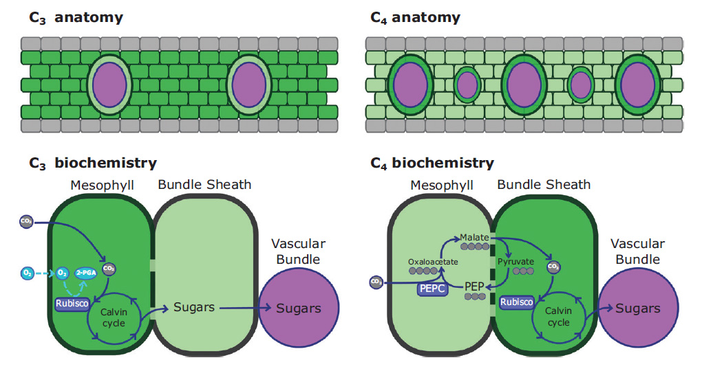 Переход к C4-фотосинтезу связан с небольшими изменениями в аминокислотных последовательностях основных ферментов, но с существенными изменениями того, когда и где эти белки экспрессируются, и изменениями морфологии листа.