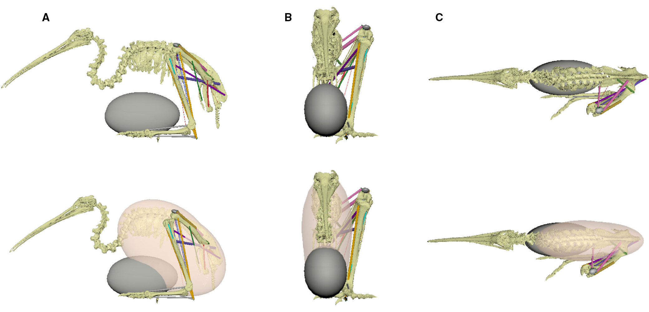 Рис. 3. Насиживающему киви приходиться опираться на яйцо. Это показано на модели опорно-двигательного аппарата северного бурого киви. A — вид сбоку, B — вид спереди, C — вид сверху. Внизу показаны также очертания тела. Изображение из статьи A. Abourachid, I. Castro, P. Provini, 2019. How to walk carrying a huge egg? Trade-offs between locomotion and reproduction explain the special pelvis and leg anatomy in kiwi (Aves; Apteryx spp.)
