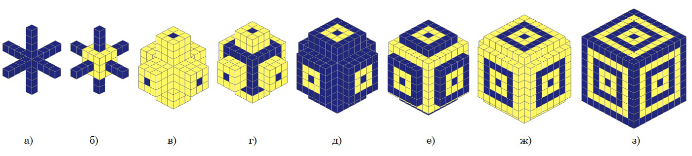 Куб составлен из единичных кубиков, которые раскрашены в два цвета так, что в результате образуются трехмерные крестовины с общим центром (на рис. 1 показана раскраска для куба 9×9×9). Торцы крестовин — это квадраты 1×1, 3×3, 5×5, ..., составленные из квадратных рамок, чередующихся по цвету.