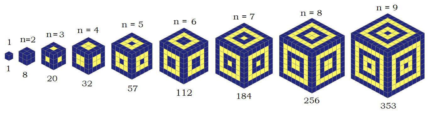 \[a_n=\left\{\begin{array}{lr}\frac12n^3, & \mathrm{если}\ r=0,\\ \frac12n^3-\frac32n+2, & \mathrm{если}\ r=1,\\ \frac12n^3+4, & \mathrm{если}\ r=2,\\ \frac12n^3-\frac32n-2, & \mathrm{если}\ r=3.\end{array}\right.\]В этой формуле n — число кубиков на ребре, r — остаток от деления n на 4. Начало этой последовательности выглядит так: 1, 8, 7, 32, 57, 112, 159, 256, 353, 504, 647, 864, 1081, 1376, 1663, 2048, 2433, 2920, 3399, 4000, 4601, 5328, 6047, 6912, 7777, 8792, 9799, 10976, 12153, 13504, 14847, 16384, 17921, 19656, 21383, ...